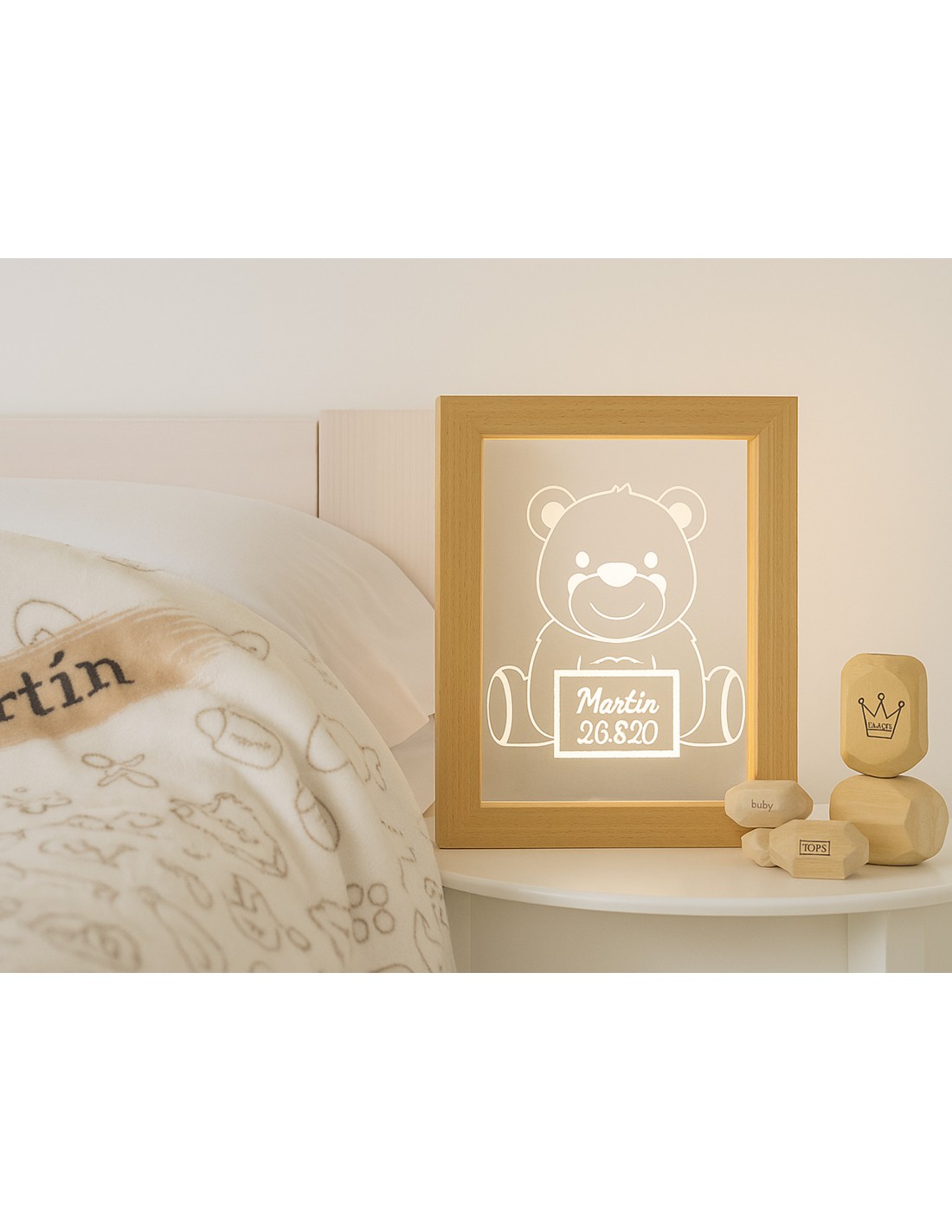 Celebra la llegada de tu pequeño con una lámpara LED personalizada que combina calidez y encanto. Con un elegante marco de madera natural, esta lámpara es perfecta para la habitación del bebé, proporcionando una luz suave y reconfortante que crea el ambiente ideal para el descanso.