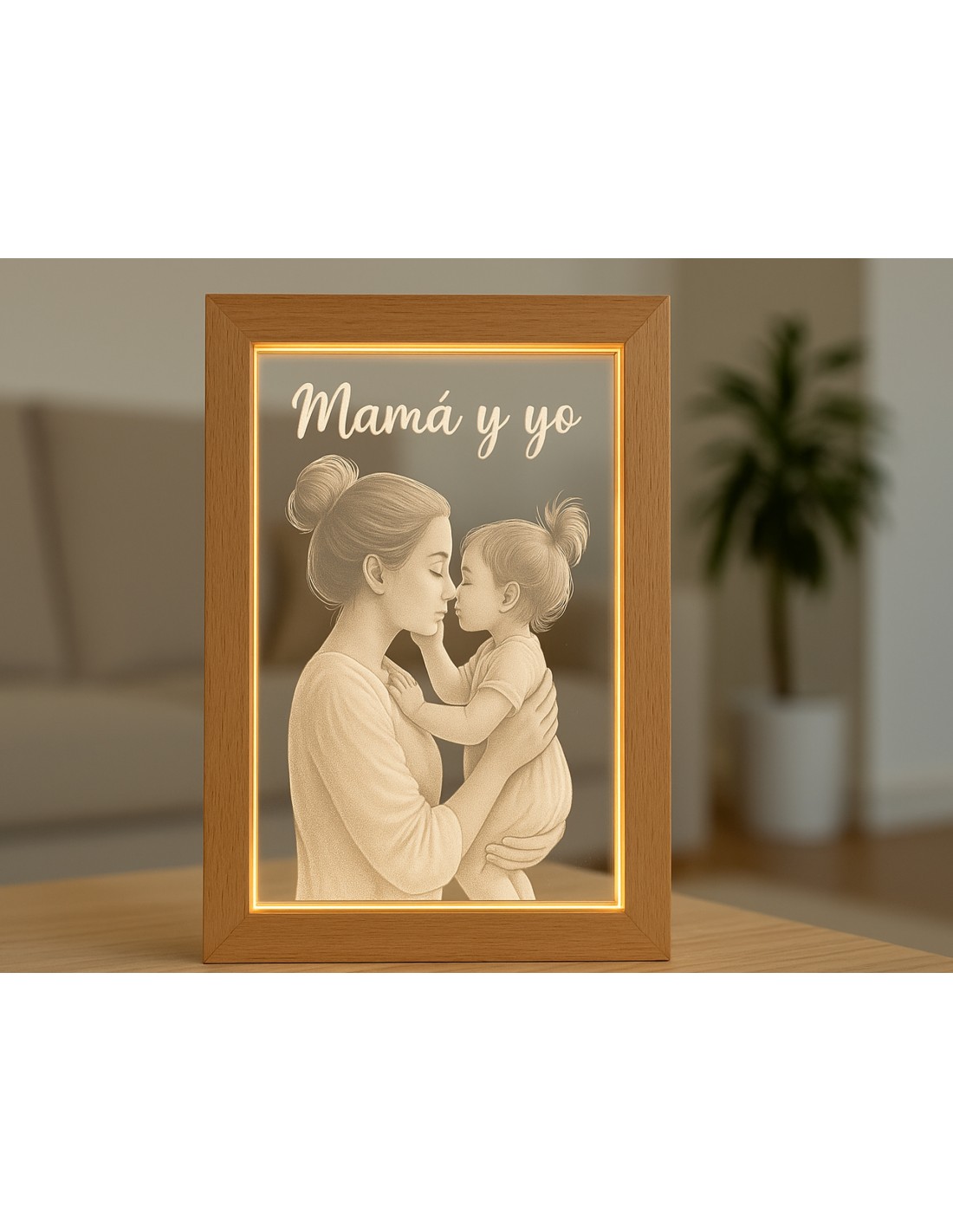 El resultado es una pieza elegante y moderna que proyecta la luz justo sobre las líneas grabadas, haciendo que la figura cobre vida en un brillo suave y acogedor. Su marco de madera aporta un toque natural y cálido, ideal para decorar cualquier rincón del hogar.