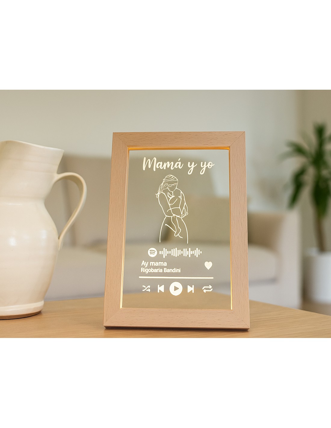 No olvide guardar su personalización para poder agregar al carritoSi la música es parte esencial de tu vida, esta lámpara con marco especial Spoty es el complemento perfecto para tu espacio. Personalizable con tu canción o playlist favorita, este marco reproduce la estética de tu plataforma de música favorita, dándole un toque moderno y único a cualquier rincón.