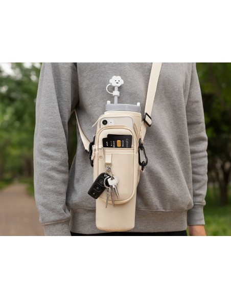 Funda para botella grande con bolsillos y colgador de llaves, personalizable con láser. Disponible en beige, gris y rosa.