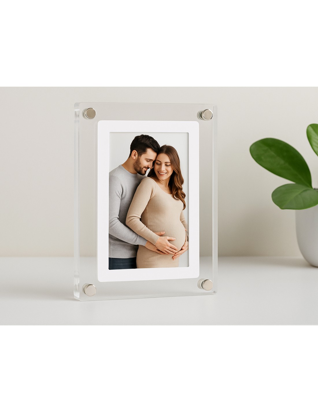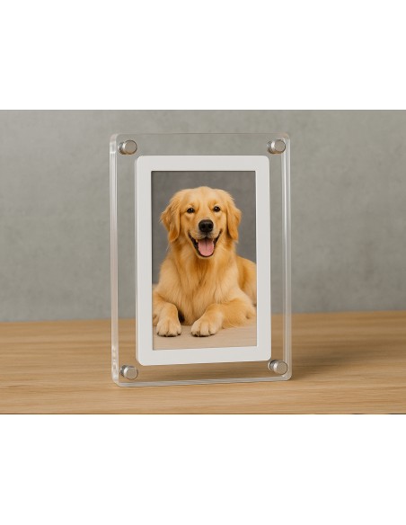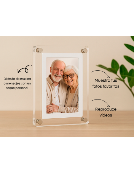 Diseñado con un estilo minimalista y materiales de calidad, su estructura transparente y su soporte estable lo convierten en un complemento perfecto para cualquier estancia del hogar o la oficina. Puedes colocarlo en el salón, la mesita de noche o tu escritorio para disfrutar de esas imágenes que te sacan una sonrisa cada día.