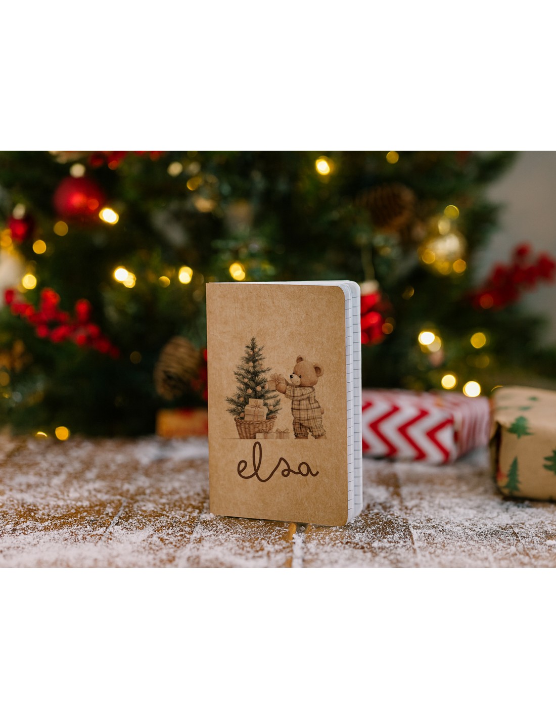 Libreta ecológica con diseño de osito junto al árbol de Navidad y nombre personalizado. Perfecta para escribir deseos, recetas o recuerdos navideños.