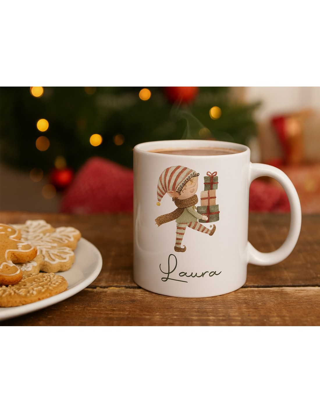 Taza navideña con elfo cargando regalos y nombre personalizado. Alegre, tierna y perfecta para llenar de magia cada desayuno.