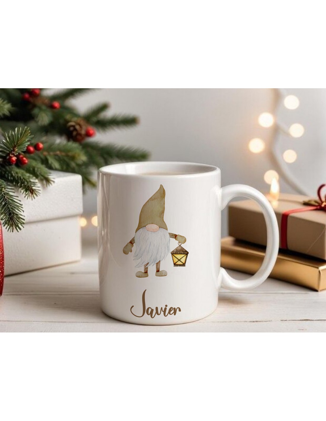 La ilustración muestra a un adorable gnomo con gorro puntiagudo, larga barba blanca y una linterna dorada, símbolo de luz y calidez durante las noches de Navidad. Debajo, el nombre personalizado añade ese toque especial que convierte cada taza en un regalo único y lleno de cariño.