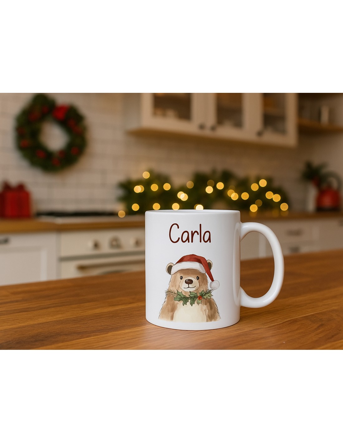 Taza navideña con diseño de oso con gorro de Papá Noel y nombre personalizado. Un detalle encantador, cálido y muy navideño.