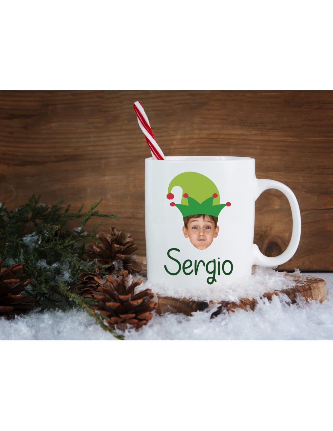 Taza de elfo personalizada con la cara y el nombre de quien tú quieras. Perfecta para regalar o disfrutar en familia durante la Navidad.
