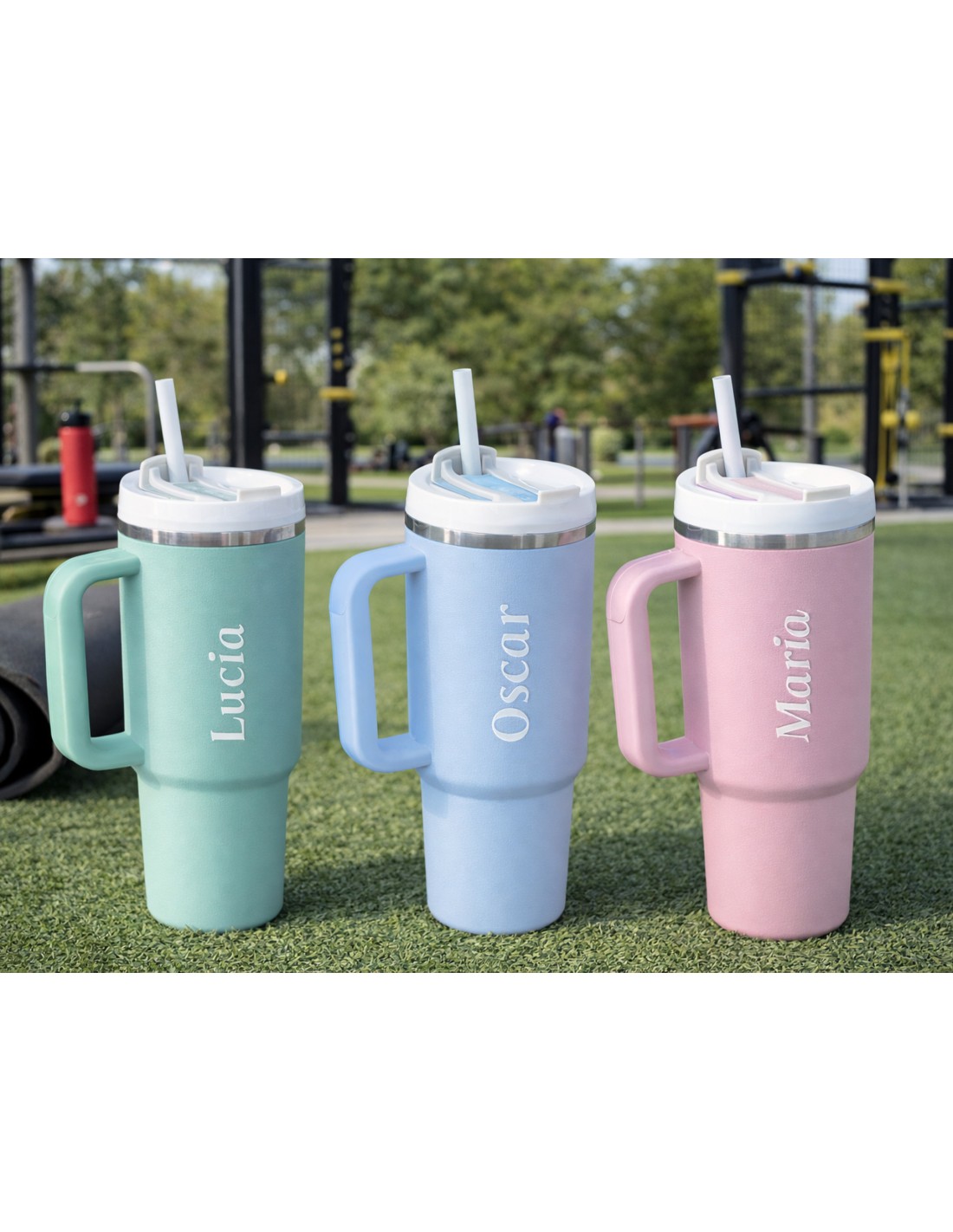Vaso térmico con asa personalizable con grabado láser, disponible en color rosa, verde y azul. Práctico, cómodo y perfecto para usar a diario o regalar.