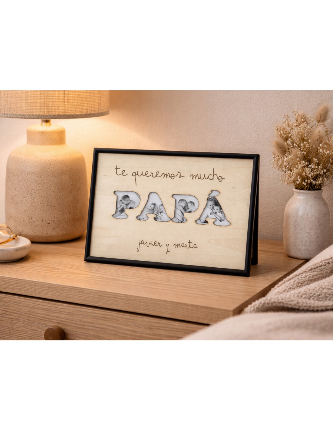 Un detalle lleno de emoción para sorprender a papá en cualquier ocasión especial. Este cuadro personalizado combina un diseño elegante y minimalista con un mensaje que llega directo al corazón: “Te queremos mucho, PAPÁ”, acompañado de los nombres que lo hacen aún más especial.